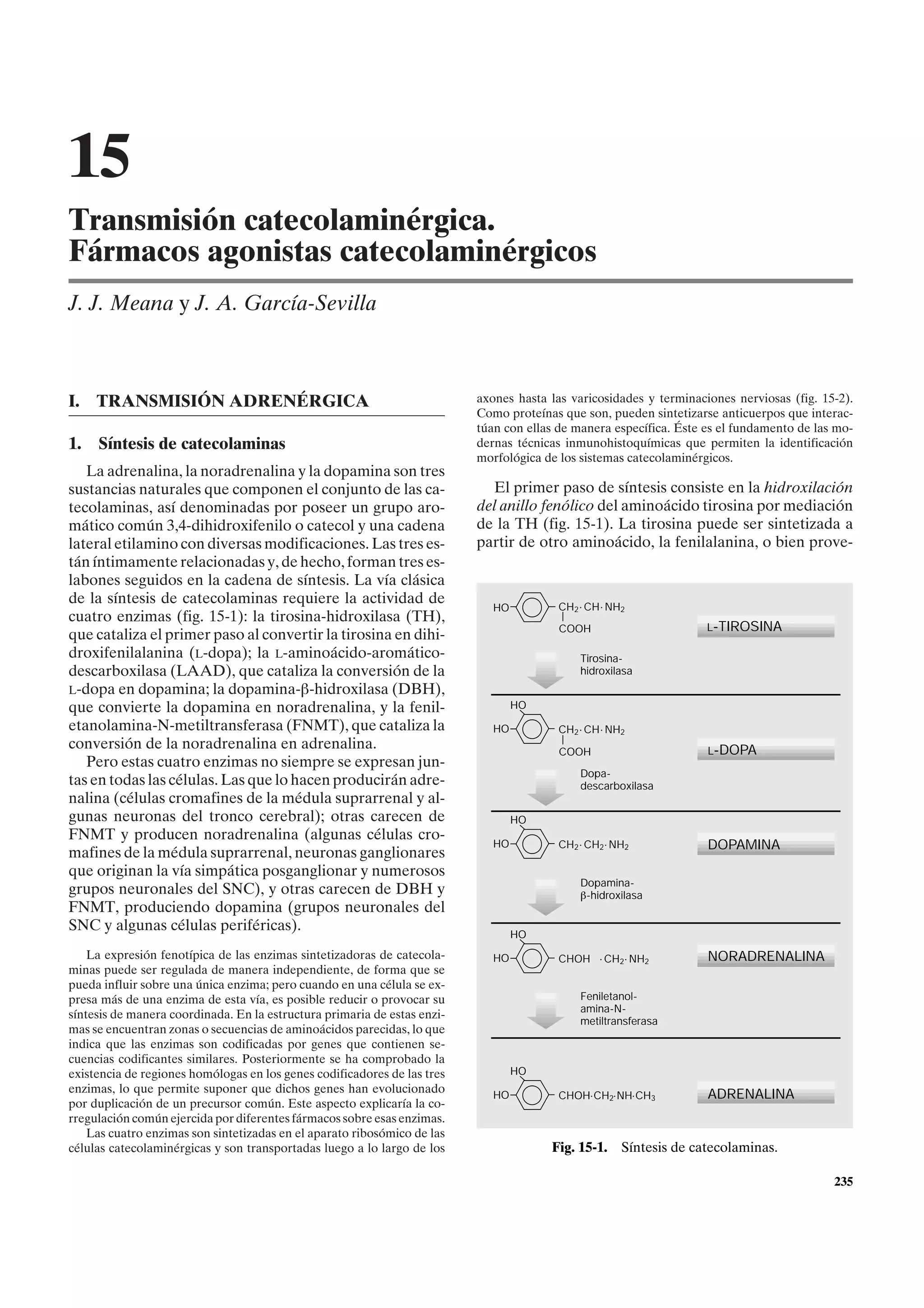 El documento describe la síntesis de catecolaminas como la adrenalina, noradrenalina y dopamina. Se requieren cuatro enzimas para su síntesis: tirosina-hidroxilasa, L-aminoácido-aromático-descarboxilasa, dopamina-b-hidroxilasa y feniletanolamina-N-metiltransferasa. La tirosina-hidroxilasa cataliza el primer paso y suele ser el factor limitante. Las catecolaminas se almacenan y liberan de las terminaciones nerviosas para activar recept