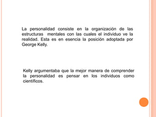 George Kelly argumentaba que la personalidad consiste en los constructos o esquemas mentales que las personas usan para interpretar la realidad. Los individuos generan constructos bipolares que luego imponen a los eventos para predecirlos. El comportamiento está determinado por los constructos que se utilizan. Kelly propuso que la mejor forma de entender la personalidad es pensar en las personas como científicos que generan constructos y los modifican según su eficiencia predictiva.