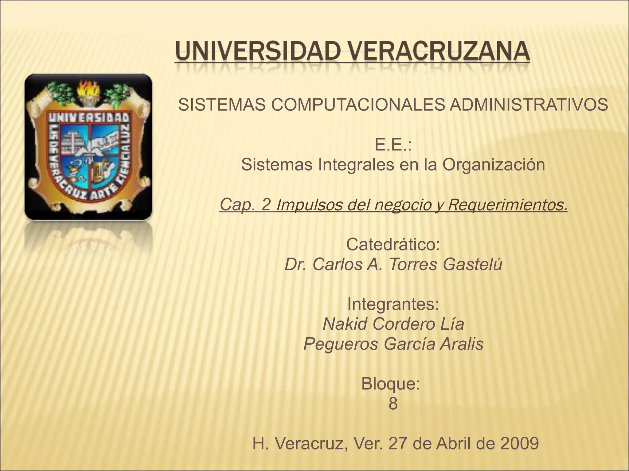 El documento habla sobre los impulsos y requerimientos del negocio que llevan a la integración empresarial. Menciona que la integración mejora la eficiencia y competitividad, satisfacción del cliente, y cumplimiento de regulaciones. También describe casos de General Motors y el Condado de Sacramento donde proyectos de integración estratégicos y tácticos mejoraron resultados del negocio y satisfacción del cliente.