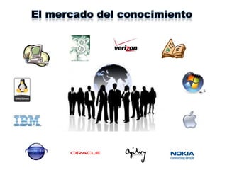 El documento habla sobre los mercados del conocimiento, sus características, ineficiencias, patologías y formas de desarrollarlos de manera más eficaz. Menciona que los mercados del conocimiento se basan en la reciprocidad, el reconocimiento y el altruismo. También analiza las ineficiencias como la información incompleta, la asimetría del conocimiento y su carácter local. Finalmente, discute cómo el uso inteligente de la tecnología, el desarrollo de mercados y la creación de valor pueden ayudar a super