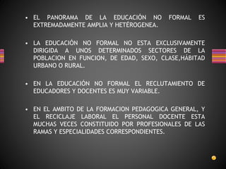 Este documento describe las características clave de la educación no formal. La educación no formal tiene un alcance amplio y heterogéneo, no está dirigida exclusivamente a sectores específicos de la población, y el reclutamiento de educadores es muy variable. Además, los programas de educación no formal se adaptan fácilmente a los territorios y sujetos, no tienen una metodología específica, y utilizan diversos métodos determinados por el contexto.