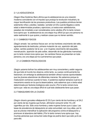 Este documento trata sobre los efectos del tabaquismo en la salud y la sociedad. Explora temas como los cambios físicos y psicológicos en la adolescencia, las causas y consecuencias de la adicción a la nicotina, y los daños que puede causar fumar en los pulmones y otros órganos. Finalmente, discute cómo el tabaquismo es un grave problema de salud pública y la principal causa de muerte prevenible en muchos países.