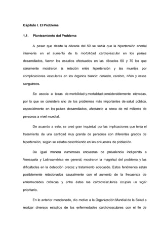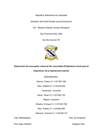 1) El documento describe un proyecto de investigación realizado por estudiantes de 4to año para elaborar gotas a base de la planta flor escondida (Phyllanthus niruri) con el objetivo de tratar la hipertensión arterial. 2) El proyecto incluye una revisión de literatura sobre usos previos de la planta para tratar la hipertensión y la diabetes, así como las características químicas de la planta. 3) Los objetivos del proyecto son caracterizar la planta, desarrollar las gotas y diagnosticar sus efect