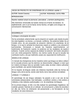 Este documento discute varios temas relacionados con la enseñanza de idiomas. Explica que debido a la diversidad lingüística, no hay un único modelo para enseñar idiomas y se requiere un análisis permanente. También describe las diferencias entre la lengua materna y las lenguas extranjeras, y cómo la primera se usa para desarrollar el pensamiento mientras que las segundas se aprenden formalmente. Finalmente, señala que los programas de inmersión han tenido éxito no solo en convertir el catalán en un