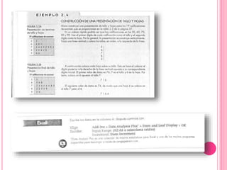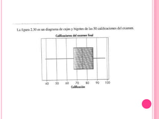 Este documento describe diferentes tipos de gráficas y diagramas que pueden usarse para resumir datos cualitativos y cuantitativos, incluyendo gráficas de pastel, de barras, diagramas de Pareto, gráficas de puntos, distribuciones de frecuencias e histogramas. También explica medidas como la media, mediana, moda, varianza y desviación estándar que resumen conjuntos de datos.