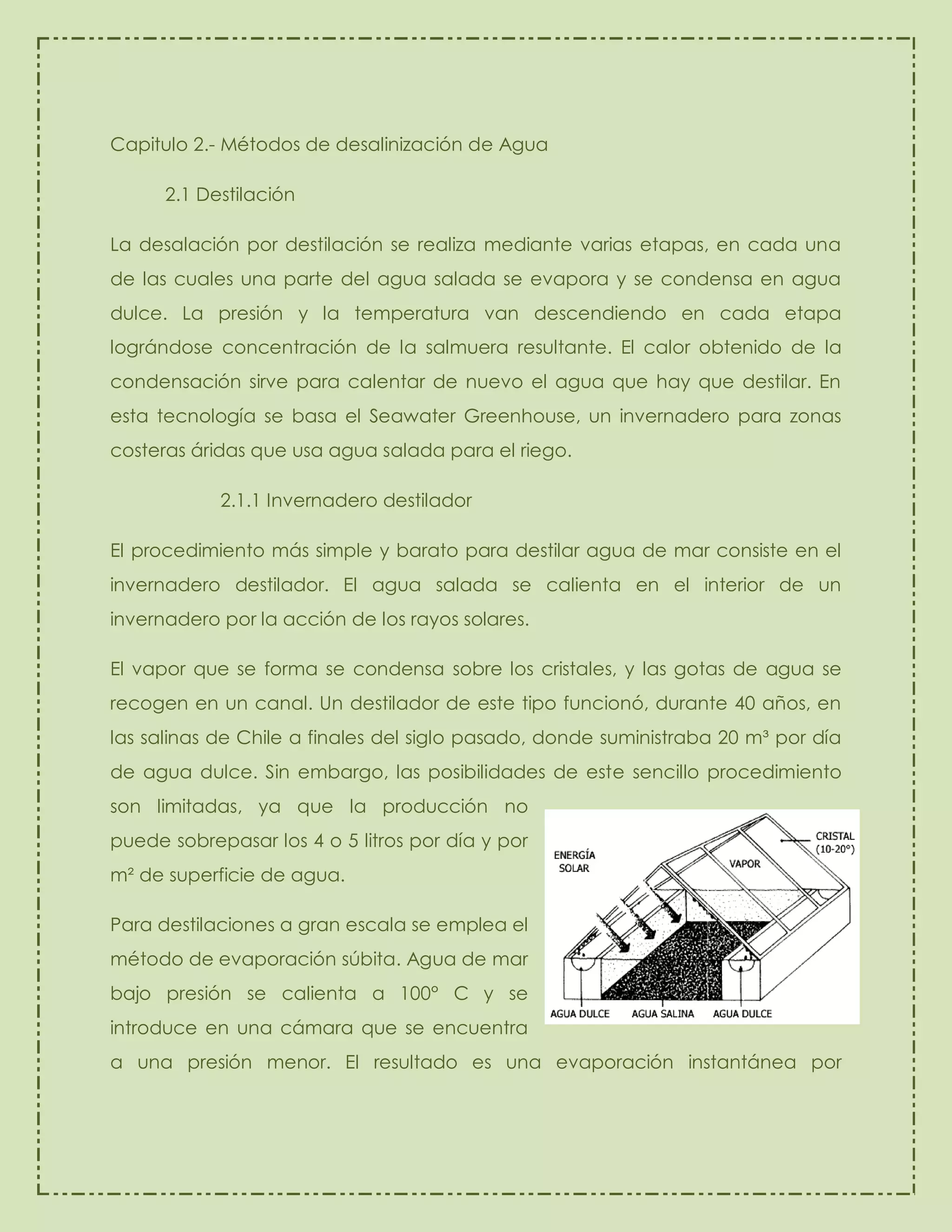 Este documento describe varios métodos para desalinizar el agua, incluyendo la destilación, osmosis inversa, electrodiálisis e incluso congelación. La destilación se realiza mediante la evaporación y condensación repetida del agua salada para separar la sal. La osmosis inversa usa membranas semipermeables y presión para forzar el agua a fluir en la dirección opuesta a la osmosis natural. La electrodiálisis usa membranas cargadas y corriente eléctrica para separar iones disueltos.