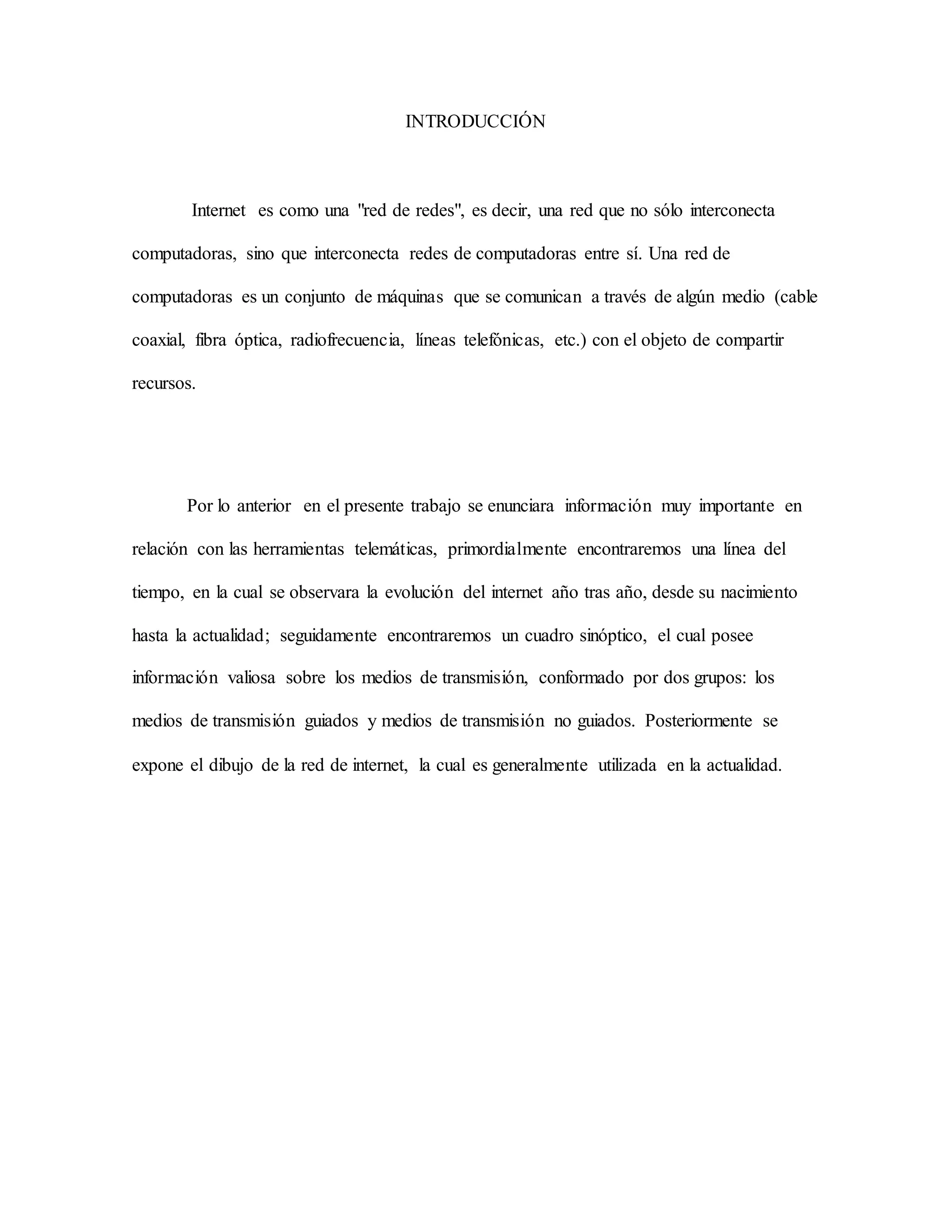 Este documento presenta información sobre las herramientas telemáticas, incluyendo una línea de tiempo sobre la evolución de Internet, un cuadro con los medios de transmisión guiados y no guiados, y un diagrama de la red de Internet. Concluye que es importante conocer cómo funciona Internet y los medios necesarios para acceder a él.