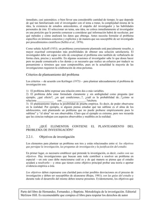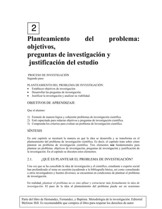 Este documento describe los pasos para plantear un problema de investigación científica. Explica que los tres elementos fundamentales para plantear un problema son los objetivos de investigación, las preguntas de investigación y la justificación del estudio. Además, discute criterios para formular objetivos y preguntas de investigación de manera clara y precisa, y que puedan ser investigados empíricamente.