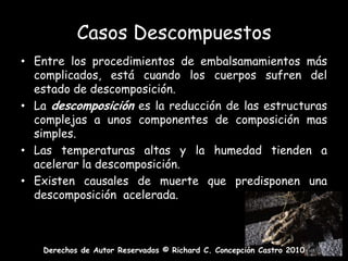 Este documento describe los protocolos para embalsamar cuerpos que se encuentran en estado de descomposición avanzada. Explica que la descomposición es un proceso natural y describe los signos y orden en que ocurre la descomposición de los tejidos, órganos y compuestos del cuerpo. También detalla el protocolo a seguir, incluyendo el uso de desinfectantes, soluciones arteriales concentradas, tratamiento hipodérmico y de las cavidades para tratar de preservar el cuerpo y reducir los olores. El objetivo es poder exhib