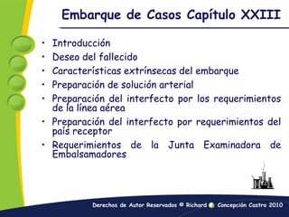 El documento habla sobre los requisitos para embarcar un cadáver en un vuelo internacional. Explica que se debe preparar el cuerpo aplicando crema humectante en la piel y membranas para prevenir la desecación. También se debe fijar bien la quijada, cubrir los ojos y envolver la cabeza y manos con celofán. Se recomienda usar una solución arterial con un índice de preservativo más alto y realizar inyecciones por la carótida y drenaje por la yugular. Finalmente, se deben tomar