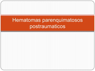 El documento describe las causas más comunes de traumatismo craneoencefálico (TCE) y contusión cerebral, incluyendo accidentes de tránsito (75%), caídas (20%) y lesiones deportivas (5%). Una complicación grave es el hematoma intraparenquimatoso, el cual puede causar daño axonal difuso, daño en el tronco del encéfalo, contusión cortical u otros daños. Se clasifican los TCE como leves, moderados o severos dependiendo de la gravedad de los síntomas. El pronó