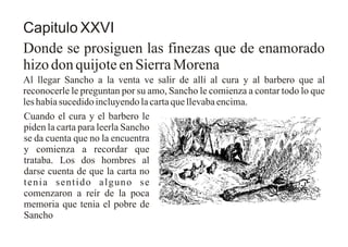 Sancho llega a una venta y se encuentra con el cura y el barbero, a quienes les cuenta todo lo que le sucedió a él y a su amo, incluyendo la carta que llevaba. Cuando el cura y el barbero piden ver la carta, Sancho se da cuenta que la ha perdido y solo recuerda parte de su contenido. Al darse cuenta que la carta no tenía sentido, el cura y el barbero se ríen de la mala memoria de Sancho.