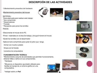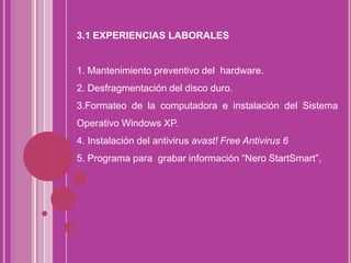 El documento describe las experiencias laborales del autor que incluyen el mantenimiento preventivo de hardware como mouse y teclado, desfragmentación de discos duros, formateo e instalación de Windows XP, instalación de antivirus Avast, y uso del programa Nero para grabar información. También analiza las fortalezas como recibir capacitación, debilidades como acumulación de trabajo, y oportunidades como atender dudas de clientes.