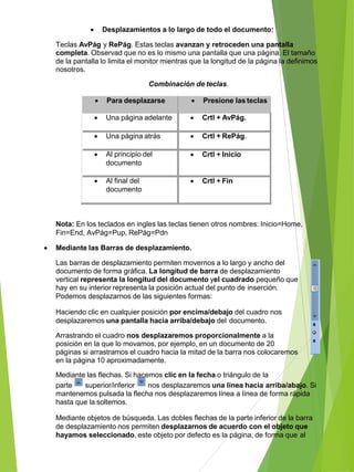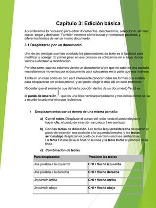 1) El documento describe las habilidades básicas de edición en Word como desplazarse, seleccionar, eliminar, copiar, pegar y deshacer cambios. 2) Explica cómo buscar y reemplazar palabras en un documento. 3) Detalla las diferentes formas de ver un documento en Word como diseño de impresión, lectura de pantalla completa, diseño web y esquema.