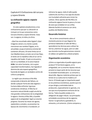Este documento presenta información sobre la civilización egipcia antigua. Describe el espacio geográfico de Egipto y cómo el río Nilo permitió el desarrollo de la agricultura y la civilización. Explica que la sociedad egipcia estaba estratificada con el faraón en la cima, seguido por sacerdotes, nobles, escribas y el pueblo. Los egipcios tenían una religión politeísta y creían en la vida después de la muerte. Dejaron contribuciones importantes en las artes, las ci