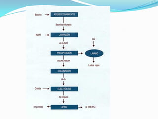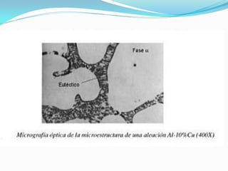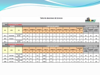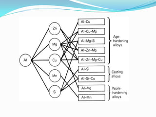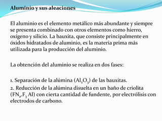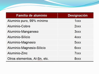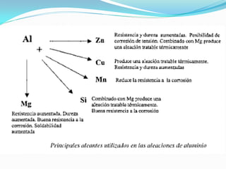 El documento describe las aleaciones de aluminio y magnesio. Explica que el aluminio se obtiene de la bauxita a través de un proceso electrolítico y que se le mejoran las propiedades mediante aleación y tratamientos térmicos. También describe las principales aleaciones de aluminio como las series 2XXX de Al-Cu, 5XXX de Al-Mg y 6XXX de Al-Si-Mg, así como sus aplicaciones. Por último, resume que el magnesio se extrae del agua de mar y se usa comúnmente como aleante de otras aleaciones no ferrosas debido