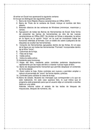 El documento describe los 15 elementos principales de la pantalla de Excel, incluyendo la barra de inicio rápido, la barra de título, botones de ventana, barras de herramientas con fichas, herramientas agrupadas, columnas, filas, celda activa, asistente de funciones, hojas, barra de desplazamiento horizontal, zoom, controles de vista y barra de estado.
