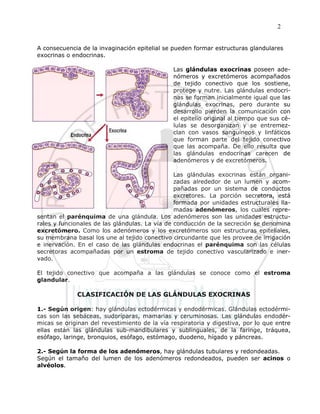 Este documento describe los diferentes tipos de epitelios glandulares. Resume las características de las glándulas exocrinas y endocrinas, y explica cómo se clasifican y organizan las glándulas según su origen, estructura, secreción y modo de liberación. También incluye detalles histológicos de varios tipos específicos de glándulas.