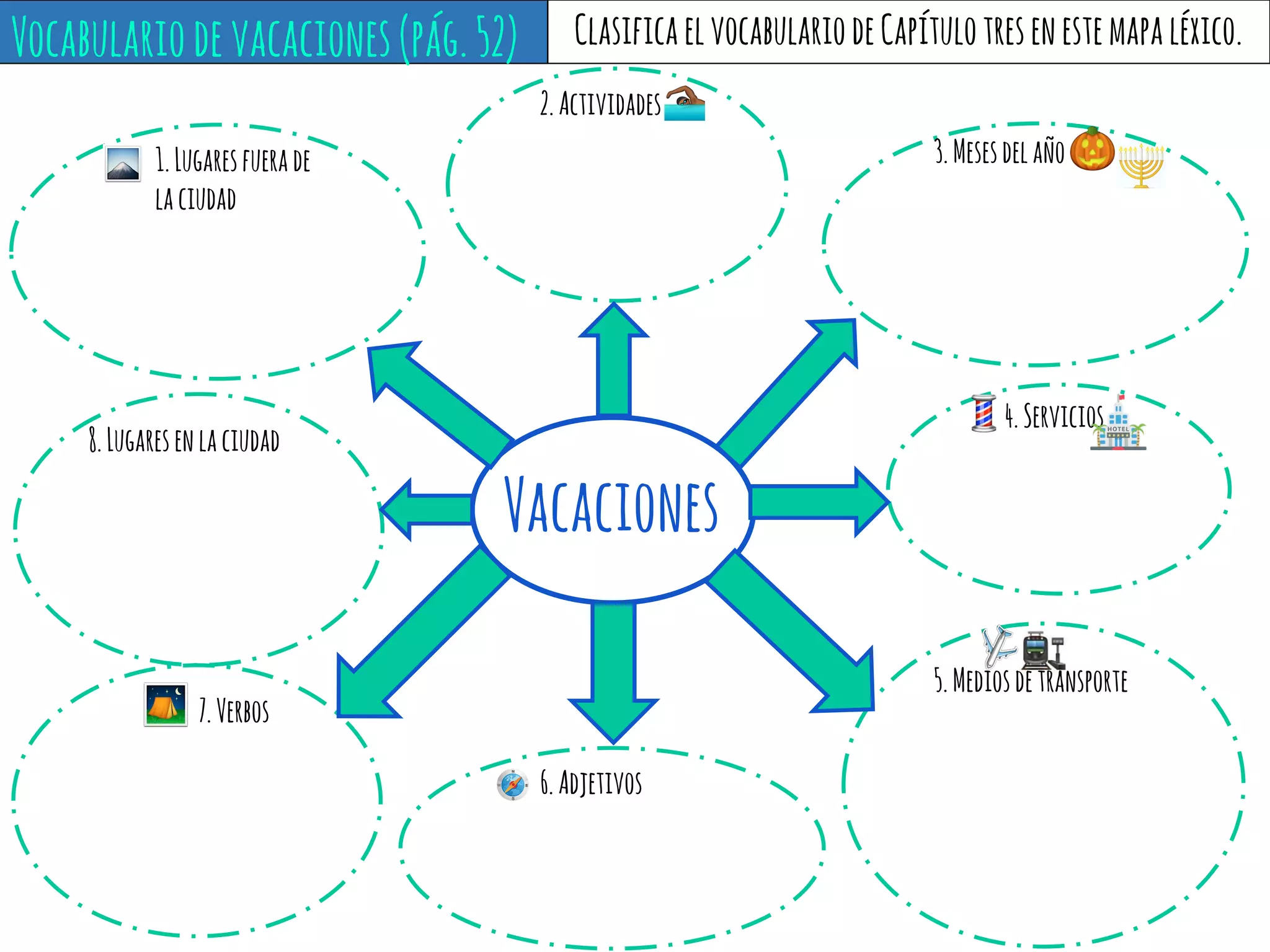 El documento clasifica diferentes tipos de vocabulario relacionado con las vacaciones en ocho categorías: meses del año, lugares fuera de la ciudad, medios de transporte, servicios, actividades, adjetivos, verbos y lugares en la ciudad.