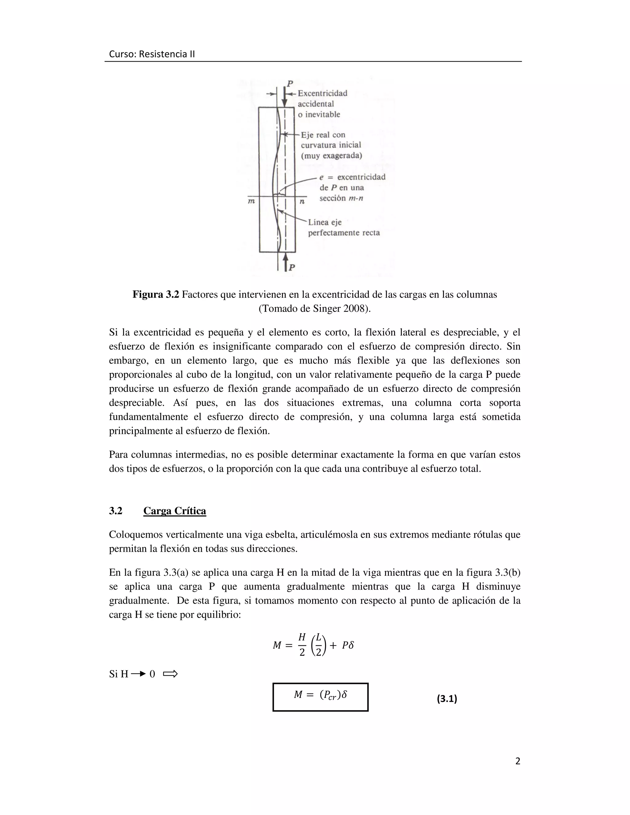 1) El documento trata sobre el pandeo en elementos sometidos a compresión como columnas. 2) Explica que las columnas pueden ser cortas, intermedias o largas dependiendo de su relación longitud-dimensión y que fallan por diferentes mecanismos. 3) Presenta la fórmula de Euler para calcular la carga crítica de pandeo de columnas largas basada en parámetros como módulo de elasticidad, momento de inercia y longitud.