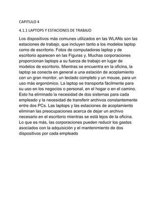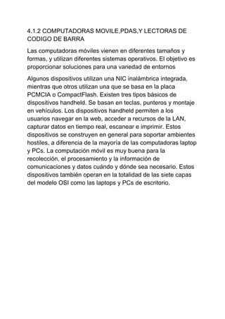 Este documento describe diferentes tipos de dispositivos inalámbricos como laptops, estaciones de trabajo, computadoras móviles y lectores de código de barra. Explica que las laptops se pueden usar tanto en la oficina como fuera de ella y que esto ha eliminado la necesidad de dos sistemas por empleado. También describe diferentes tipos de controladores, acces points, bridges, antenas y redes cableadas.