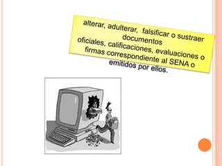 Este documento enumera varias prohibiciones para los aprendices del SENA. Entre ellas se encuentran plagiar materiales y trabajos, terminar unilateralmente el contrato de aprendizaje sin el consentimiento del empleador y el SENA, incumplir con las actividades acordadas, realizar fraude en evaluaciones, suplantar identidades, fumar o suministrar alcohol en las instalaciones, utilizar el nombre del SENA con fines de lucro, hurtar, dañar las instalaciones, obstaculizar el acceso a los centros de formación, practicar jue
