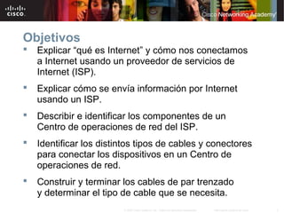 Este documento explica cómo las personas se conectan a Internet a través de proveedores de servicios de Internet y cómo se envía información a través de la red. Describe los componentes de un Centro de operaciones de red de un ISP y los diferentes tipos de cables y conectores utilizados. También cubre temas como direcciones IP, protocolos de Internet, y construcción y terminación de cables de red.