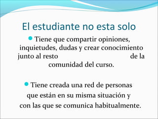 Este documento describe los beneficios del aprendizaje colaborativo mediado por tecnología. Explica que los estudiantes ya no aprenden solos, sino que comparten opiniones y conocimiento con otros en una comunidad de aprendizaje. El trabajo colaborativo genera debates e intercambio de información que facilita la construcción social del conocimiento. Además, tres factores clave influyen en el aprendizaje colaborativo mediado por tecnología: la situación de aprendizaje, las características del grupo y la tecnología utilizada.