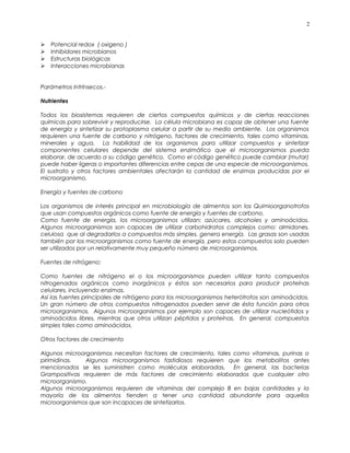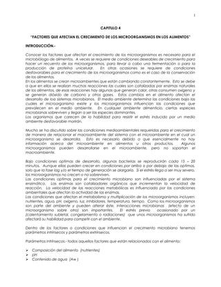 Este documento describe varios factores que afectan el crecimiento de microorganismos en los alimentos, incluyendo nutrientes, agua, pH, oxígeno, temperatura e inhibidores. Explica que las condiciones óptimas para el crecimiento microbiano son influenciadas por el sistema enzimático de cada microorganismo. También describe parámetros intrínsecos como la composición del alimento y parámetros extrínsecos que afectan el crecimiento microbiano.