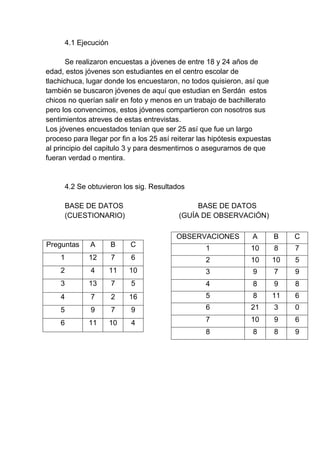 El documento presenta los resultados de encuestas realizadas a 25 jóvenes de 18 a 24 años sobre la influencia de la familia en su autoestima. Los gráficos muestran que los jóvenes se sienten solos y con falta de comunicación con sus padres, pero no hay muchas peleas familiares. La hipótesis de que el amor familiar influye en la autoestima y éxito estudiantil se valida.