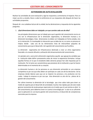 El documento habla sobre la gestión del conocimiento y las dimensiones que deben trabajarse para que ocurra de manera efectiva en una organización. Estas dimensiones son la infraestructura organizativa, la dimensión humana y la tecnológica. Cada dimensión debe interactuar con las demás para intercambiar paquetes de conocimiento. La infraestructura busca crear un clima favorable para la creación, difusión y uso del conocimiento. La dimensión humana se enfoca en las personas y su participación. Y la tecnología sirve como soporte
