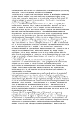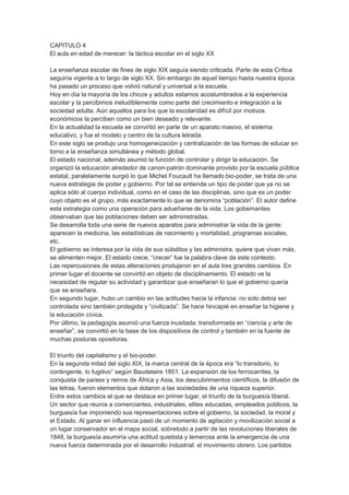 Este documento describe los cambios en la educación y la sociedad durante el siglo XIX y XX, incluyendo la expansión del capitalismo, el surgimiento del estado de bienestar, y el desarrollo de nuevas formas de gobernar a la población a través de la regulación y normalización. También analiza el surgimiento de la pedagogía como ciencia y el debate entre los pedagogos "normalizadores" que querían imponer la cultura dominante versus los "escolanovistas" que apoyaban los intereses de los niños.