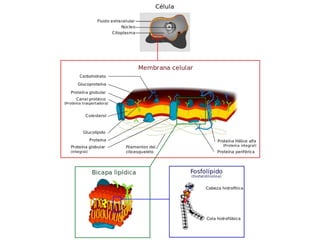 La membrana plasmática actúa como una barrera semipermeable que regula el transporte de sustancias hacia adentro y hacia afuera de la célula. El transporte puede ser pasivo, utilizando el gradiente de concentración sin gasto de energía, o activo, que requiere ATP para mover sustancias en contra del gradiente. Existen diferentes mecanismos de transporte, incluidos difusión simple, facilitada, osmosis, y transporte en masa a través de endocitosis y exocitosis.