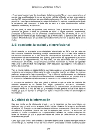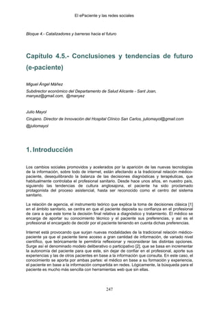 Este documento discute el papel creciente del paciente (epaciente) en la era digital y las redes sociales. Resalta que las nuevas tecnologías están cambiando la tradicional relación médico-paciente al darle al paciente más acceso a información y participación en decisiones médicas. Sin embargo, también plantea preocupaciones sobre la calidad y seguridad de la información disponible online. El documento concluye que aunque las redes sociales pueden empoderar a los pacientes, los profesionales médicos siguen desempeñando un pap