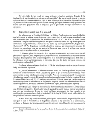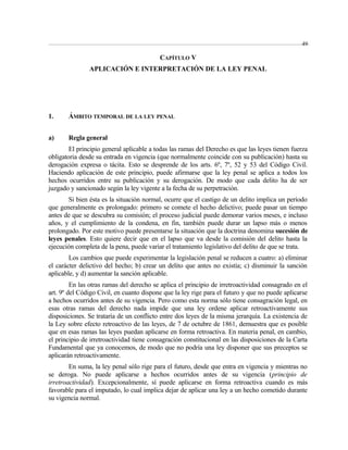 Este documento discute el principio de irretroactividad de la ley penal y sus excepciones. Explica que la ley penal solo se aplica a hechos ocurridos durante su vigencia, pero que puede aplicarse retroactivamente si una nueva ley es más favorable para el acusado. Analiza el debate sobre si una ley más benigna puede aplicarse desde su promulgación o solo desde su entrada en vigor. Concluye argumentando que para garantizar la seguridad jurídica, la ley más favorable solo debe aplicarse retroactivamente una vez haya entrado en vigor.