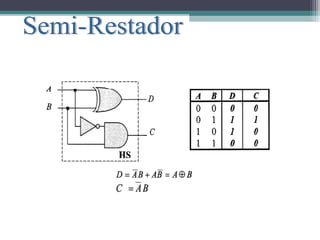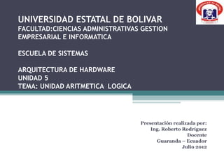 Este documento describe la unidad aritmética y lógica (ALU) de una computadora. Explica que la ALU realiza operaciones aritméticas como suma y resta, así como operaciones lógicas como AND y OR. También describe cómo una ALU puede realizar operaciones simples como suma y resta, así como operaciones más complejas mediante algoritmos iterativos o coprocesadores especializados. Finalmente, muestra un circuito capaz de procesar palabras de bits utilizando circuitos idénticos controlados por señales de operación.