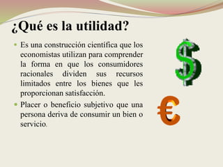 Este documento resume conceptos clave sobre la demanda y comportamiento del consumidor desde una perspectiva económica. Explica que la utilidad es la satisfacción que proporciona un bien y que la utilidad marginal decrece a medida que aumenta el consumo. También describe cómo la demanda individual se suma para formar la demanda del mercado y cómo esta se puede desplazar. Por último, analiza mercados de bienes de adicción como el tabaco y las drogas, y cómo la prohibición puede afectar la oferta y demanda.