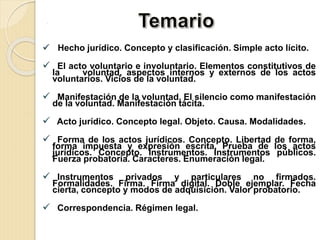 Este documento resume los principales conceptos relacionados con las instituciones del derecho privado. Explica los conceptos de hecho jurídico, acto voluntario e involuntario, manifestación de la voluntad, acto jurídico, sus elementos, formas y formalidades. También analiza los vicios de la voluntad como el error, dolo y violencia, y sus efectos en la validez de los actos jurídicos. Por último, introduce los conceptos de forma, objeto y causa de los actos jurídicos.