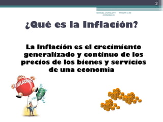El documento trata sobre la inflación. Define la inflación como el crecimiento generalizado y continuo de los precios en una economía. Explica que la inflación se mide a través del Índice de Precios al Consumidor y el Índice de Precios Implícitos en el PBI. También describe las teorías de la inflación de demanda, costos y estructural, y los efectos perjudiciales de la inflación como la pérdida del poder adquisitivo, la incertidumbre y el desempleo.