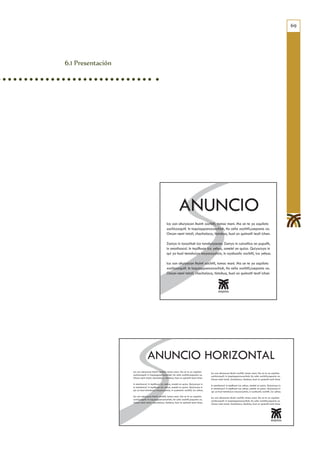 El documento describe el sistema de publicidad y elementos promocionales de una organización. Se menciona que incluye anuncios oficiales, publicidad general, carteles, folletos, libros, revistas, material audiovisual, pegatinas, adhesivos y material promocional como pancartas y distintivos.