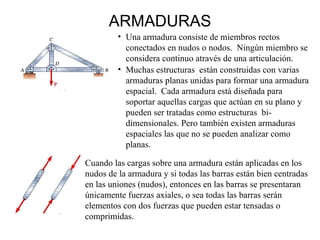 El documento describe tres categorías de estructuras: armaduras, armazones y máquinas. Las armaduras están formadas por miembros rectos conectados en nudos y solo soportan fuerzas axiales. Los armazones contienen al menos un miembro sometido a tres o más fuerzas. Las máquinas transmiten y modifican fuerzas.