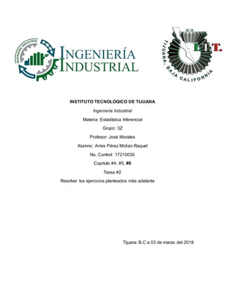 Este documento contiene información sobre ejercicios de estadística inferencial de un capítulo sobre distribuciones normales. Incluye 4 ejercicios resueltos sobre temas como distribuciones normales estándar, aplicaciones de distribuciones normales, distribuciones muestrales y estimadores, y el teorema del límite central. El documento proporciona contexto estadístico y soluciones a los ejercicios planteados como parte de una tarea universitaria de estadística inferencial.