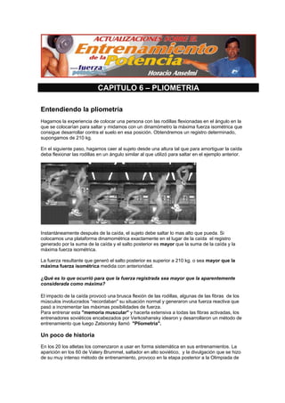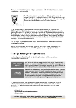 El documento describe los principios y beneficios del entrenamiento pliométrico. Explica que la pliometría involucra movimientos rápidos que pasan de una contracción excéntrica a una concéntrica, aprovechando la fuerza reactiva generada. También describe métodos para evaluar la fuerza reactiva a través de saltos y la importancia de la preparación previa para realizar entrenamiento pliométrico de forma segura.