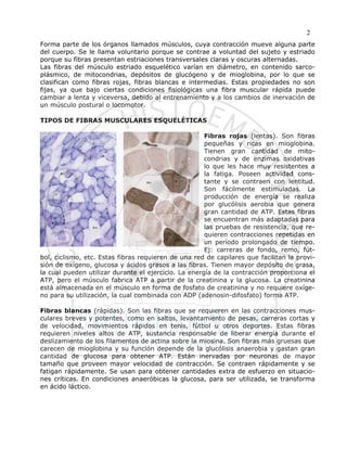 El tejido muscular es responsable del movimiento y la locomoción. Existen tres tipos principales de tejido muscular: esquelético, cardíaco y liso. El tejido muscular esquelético se inserta en los huesos a través de tendones y es responsable del movimiento voluntario. Está compuesto de fibras musculares alargadas multinucleadas que contienen miofibrillas formadas por filamentos de actina y miosina, responsables de la contracción muscular.