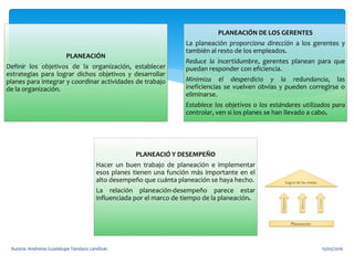 El documento describe los fundamentos de la planeación para las organizaciones. Explica que la planeación implica definir objetivos, establecer estrategias para lograrlos, y desarrollar planes para coordinar las actividades. También señala que la planeación proporciona dirección a los gerentes y empleados, reduce la incertidumbre, y minimiza el desperdicio. Finalmente, destaca que la planeación es importante para los gerentes porque les enseña a establecer objetivos y planear con flexibilidad ante cambios.