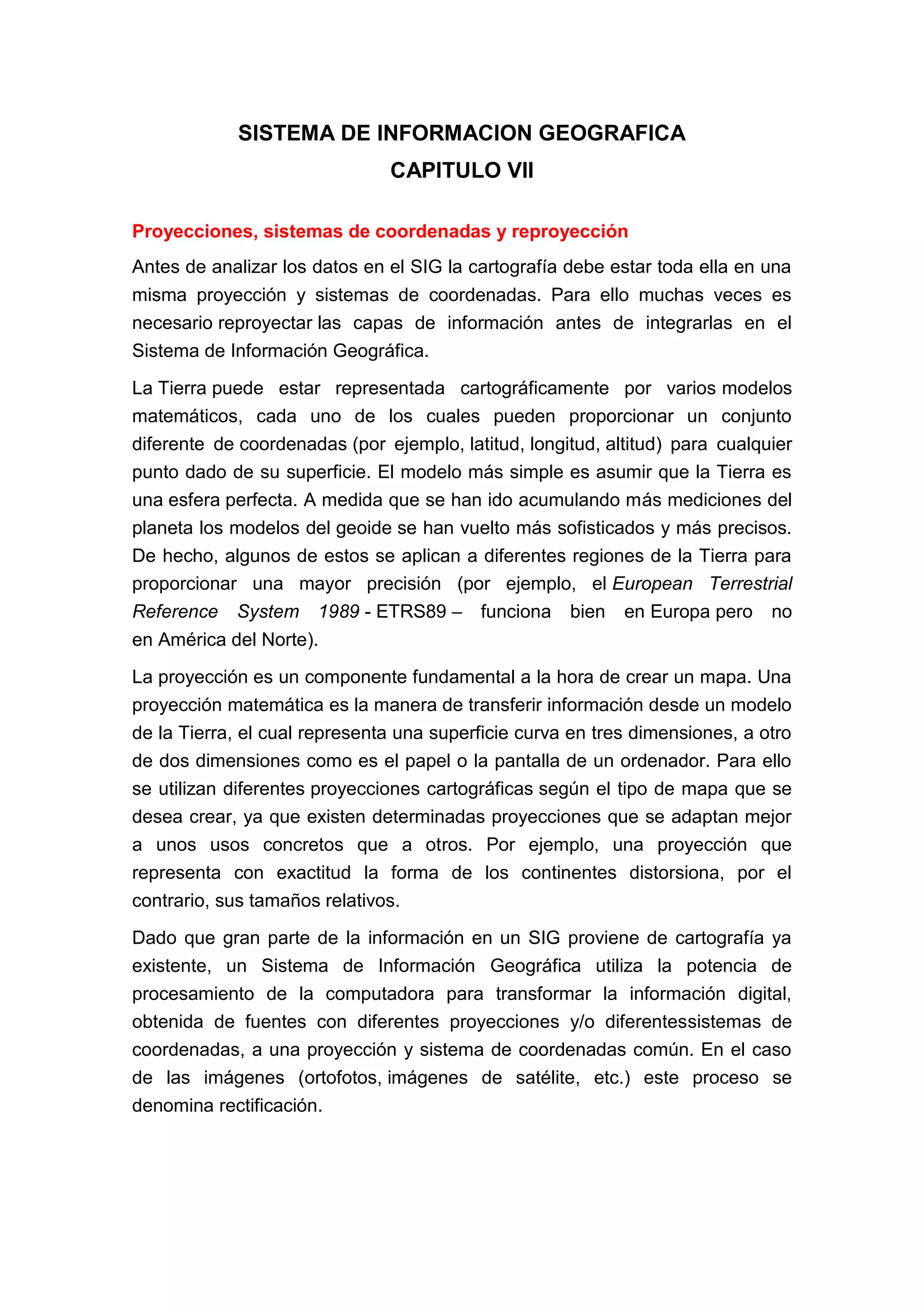 Antes de analizar datos en un SIG, toda la cartografía debe estar en la misma proyección y sistema de coordenadas, lo que a menudo requiere reproyectar capas de información. Una proyección transfiere información de un modelo de la Tierra tridimensional a una representación bidimensional, y diferentes proyecciones se adaptan mejor a usos específicos. Un SIG usa la potencia de procesamiento para transformar datos de diferentes fuentes a una proyección y sistema de coordenadas comunes.