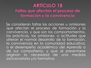 Este documento establece las faltas académicas y disciplinarias que pueden cometer los aprendices y los criterios para calificarlas. Las faltas incluyen acciones u omisiones que afectan el proceso de formación o la convivencia. Las faltas académicas ocurren cuando el aprendiz incumple prohibiciones, deberes o se extralimita en derechos académicos. Las faltas disciplinarias ocurren al incumplir prohibiciones, deberes o derechos comportamentales. Las faltas