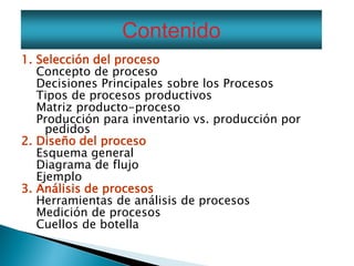 Este documento describe los conceptos y herramientas clave para el análisis y diseño de procesos productivos. Explica los tipos de procesos, la toma de decisiones sobre procesos, diagramas de flujo y matrices producto-proceso. También cubre temas como medición de procesos, cuellos de botella y herramientas para el análisis como diagramas de flujo y mapas de procesos. El objetivo final es diseñar procesos eficientes mediante el estudio y mejora continua de los procesos existentes.
