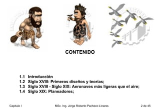 CONTENIDO 1.1  Introducción  1.2  Siglo XVIII: Primeros diseños y teorías;  1.3  Siglo XVIII - Siglo XIX: Aeronaves más ligeras que el aire;  1.4  Siglo XIX: Planeadores;