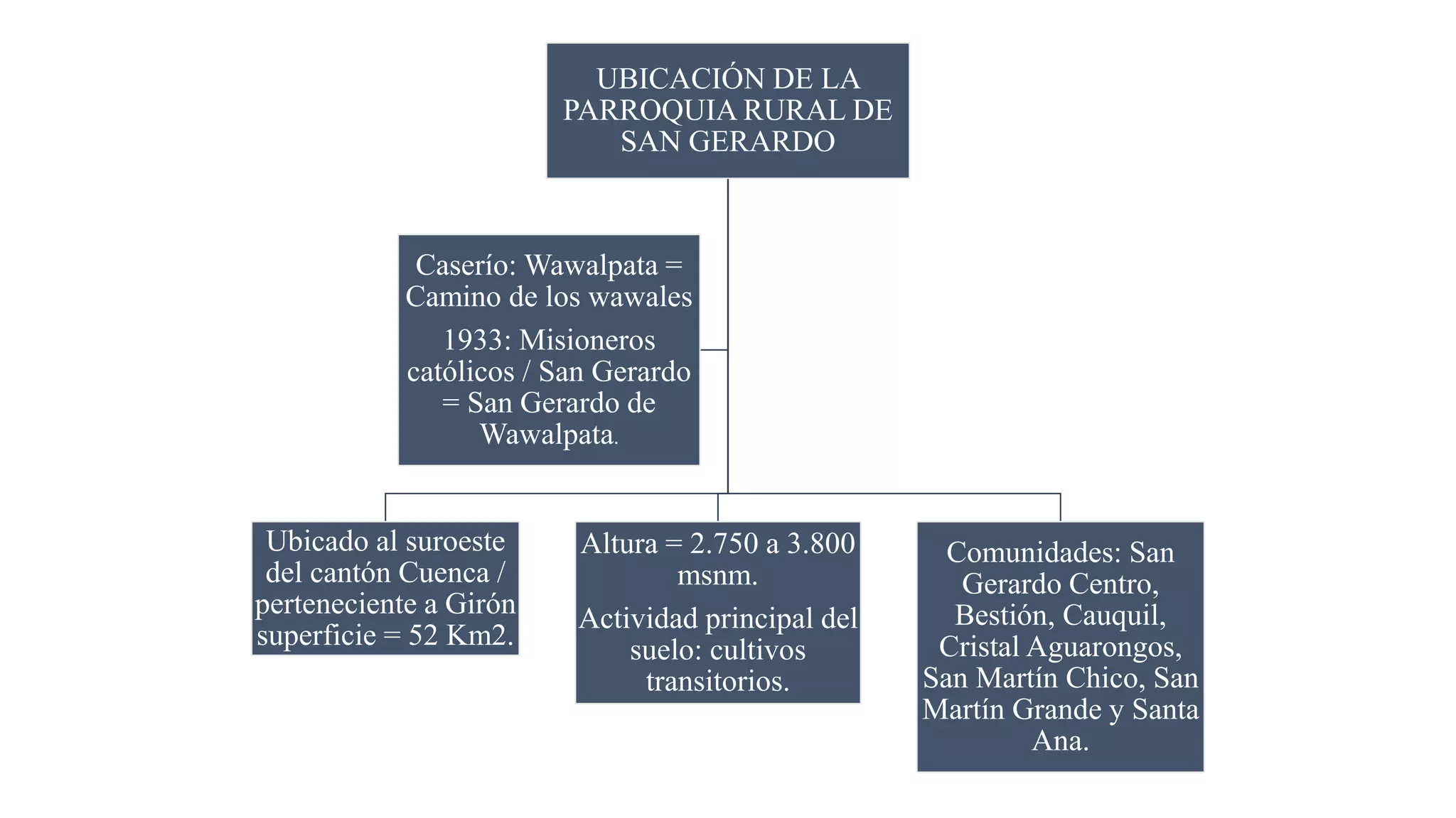 La parroquia rural de San Gerardo se ubica al suroeste del cantón Cuenca en Ecuador, con un área de 52 km2 entre 2.750 y 3.800 msnm. Sus principales comunidades son San Gerardo Centro, Bestión, Cauquil, Cristal Aguarongos, San Martín Chico, San Martín Grande y Santa Ana. La actividad principal es la agricultura de cultivos transitorios. El proyecto minero Loma Larga se encuentra a 30 km al suroeste de Cuenca y tiene un área total de 8.030 hectáreas, a